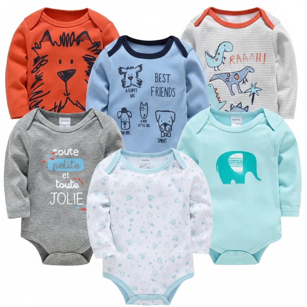 Lot de 6 bodies bébé garçon à manches longues, motifs animaux et véhicules, confort doux Kalinatur.
